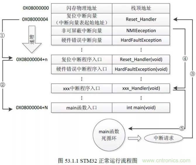 上圖表示STM32正常運行的流程圖,可以看到上電復位后系統從0x80000004處開始運行程序,這里放置的是復位中斷向量,然后跳轉至復位中斷程序入口后再跳轉至main函數運行用戶的程序。