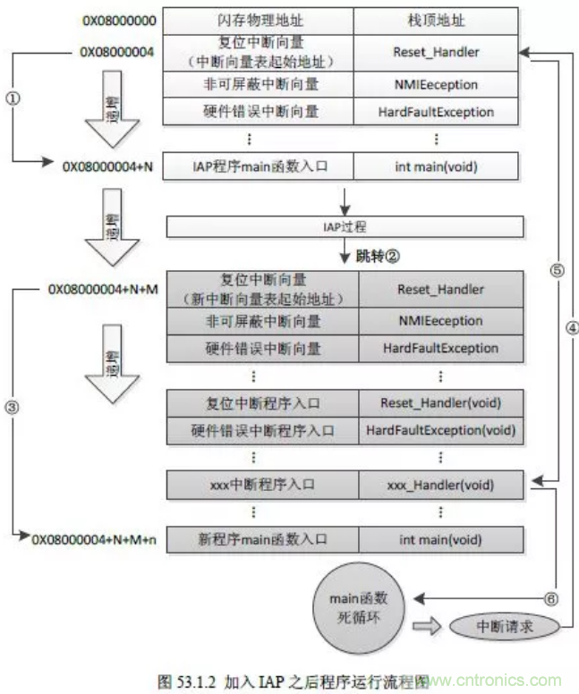后面的過程和STM32正常運行一樣,如果出現中斷請求,還是跳轉到A區域中的中斷向量表中,然后再跳轉到B區域的中斷服務入口。