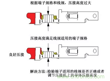 過大的壓接高度也無法有效壓接芯線,會形成壓接區過大的無效空隙,使芯線和端子金屬之間沒有足夠的緊接。