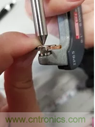 3. 把千分尺平葉片測量頭跨在芯線壓接處的中間位置 (圖 4) 。不要在芯線的喇叭口附近測量。