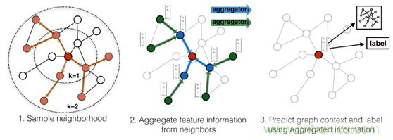 學(xué)術(shù)界已對(duì)GNN算法進(jìn)行了非常多的研究討論,并提出了數(shù)目可觀的創(chuàng)新實(shí)現(xiàn)方式。其中,斯坦福大學(xué)在2017年提出的GraphSAGE是一種用于預(yù)測(cè)大型圖中動(dòng)態(tài)新增未知節(jié)點(diǎn)類型的歸納式表征學(xué)習(xí)算法,特別針對(duì)節(jié)點(diǎn)數(shù)量巨大、且節(jié)點(diǎn)特征豐富的圖做了優(yōu)化。如下圖所示,GraphSAGE計(jì)算過(guò)程可分為三個(gè)主要步驟: