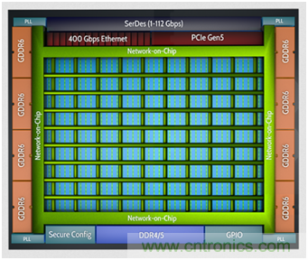 Achronix公司推出的Speedster7t系列高性能FPGA,專門針對(duì)數(shù)據(jù)中心和機(jī)器學(xué)習(xí)工作負(fù)載進(jìn)行了優(yōu)化,消除了CPU、GPU以及傳統(tǒng) FPGA 存在的若干性能瓶頸。Speedster7t FPGA 基于臺(tái)積電的 7nm FinFET工藝,其架構(gòu)采用革命性的新型 2D 片上網(wǎng)絡(luò)(NoC),獨(dú)創(chuàng)的機(jī)器學(xué)習(xí)處理器矩陣(MLP),并利用高帶寬 GDDR6 控制器、400G 以太網(wǎng)和 PCI Express Gen5 接口,在保障ASIC 級(jí)別性能的同時(shí),為用戶提供了靈活的硬件可編程能力。下圖展示了Speedster7t1500高性能FPGA的架構(gòu)。