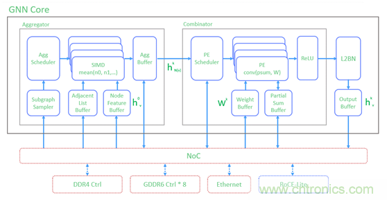 圖中GNNCore為算法實(shí)現(xiàn)的核心部分,其設(shè)計(jì)細(xì)節(jié)將在下文展開(kāi)談?wù)?;RoCE-Lite為RDMA協(xié)議的輕量級(jí)版本,用于通過(guò)高速以太網(wǎng)進(jìn)行遠(yuǎn)程內(nèi)存訪問(wèn),以支持海量節(jié)點(diǎn)的Graph計(jì)算,其設(shè)計(jì)細(xì)節(jié)將在本公眾號(hào)的后續(xù)文章中討論;400GE以太網(wǎng)控制器用來(lái)承載RoCE-Lite協(xié)議;GDDR6用于存放GNN處理過(guò)程中所需的高速訪問(wèn)數(shù)據(jù);DDR4作為備用高容量?jī)?nèi)存,可以用于存儲(chǔ)相對(duì)訪問(wèn)頻度較低的數(shù)據(jù),比如待預(yù)處理的Graph;PCIeGen5x16提供高速主機(jī)接口,用于與服務(wù)器軟件交互數(shù)據(jù);上述所有模塊,皆通過(guò)NoC片上網(wǎng)絡(luò)來(lái)實(shí)現(xiàn)高速互聯(lián)。