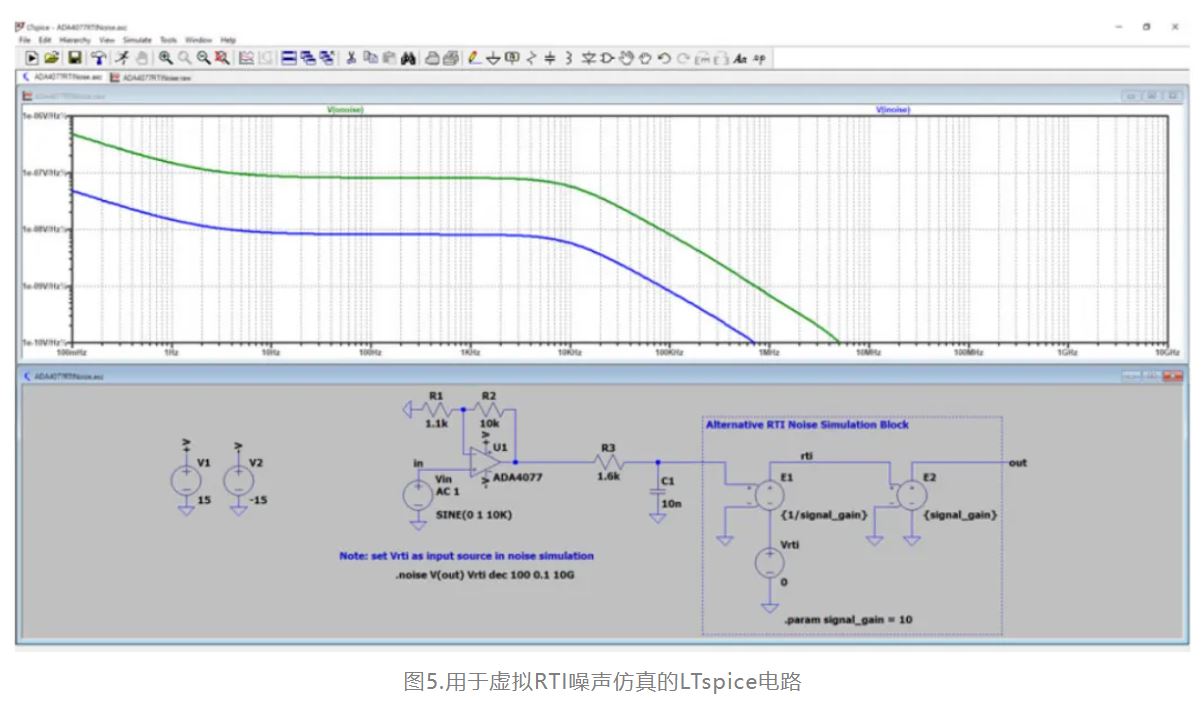 LTspice的多功能性和準確性使其對噪聲仿真非常有用。輸出節點和輸入源在噪聲仿真命令中指定,輸出噪聲(RTO)是查看分析結果的默認方式。LTspice還會根據RTI的傳統定義計算參考到指定輸入源的輸入噪聲,但如圖4所示,對傳統RTI噪聲進行積分無法提供有意義的結果。圖5顯示了如何在LTspice的輸出中添加一級,以便仿真器返回替代的虛擬RTI噪聲。運行仿真后,在選定圖形的情況下,從Plot Settings—Add Trace將輸入噪聲添加到圖形中,然后選擇V(inoise)。這會將輸入噪聲添加到圖形中。曲線形狀與輸出噪聲相匹配,表明整個電路的頻率響應都得到了考慮。在按住ctrl鍵的同時左鍵單擊圖形中標題為"V(inoise)"的曲線,以對總RTI噪聲進行積分。