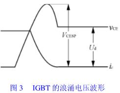 圖中:VCE為IGBT集電極-發(fā)射極間的電壓波形;ic為IGBT的集電極電流;Ud為輸入IGBT的直流電壓;VCESP=Ud+Ldic/dt,為浪涌電壓峰值。