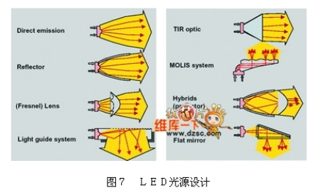 光學(xué)設(shè)計(jì)時(shí)先考慮法規(guī)需求,討論視角與強(qiáng)度關(guān)系,以近燈為例須針對(duì)其特殊的15度揚(yáng)角設(shè)計(jì),如圖5所示。在傳統(tǒng)的燈具設(shè)計(jì)上由先期的利用反射罩配合透鏡刻紋作角度與強(qiáng)度的控制,演變成為利用反射罩直接控制強(qiáng)度角度,也發(fā)展出利用成像方式的魚(yú)眼透鏡設(shè)計(jì)法。不論何種的設(shè)計(jì)方式都須先考慮選用光源的特性,特別是角度與強(qiáng)度的光型輸出(Beam pattern),對(duì)傳統(tǒng)的光源而言,大多為柱狀光源,可產(chǎn)生類似蝴蝶外型的光型輸出,進(jìn)而發(fā)展出來(lái)與之搭配的透鏡、反射罩、擋板、透鏡等光學(xué)組件。而利用LED作為光源設(shè)計(jì)燈具時(shí),需重新考慮其光學(xué)特性由傳統(tǒng)的柱狀光源變?yōu)槠矫婀庠矗ú煌姆庋b設(shè)計(jì)有不同的光型輸出),進(jìn)而搭配外部的光學(xué)組件而產(chǎn)生不同組合以應(yīng)用于不同產(chǎn)品,依照德國(guó)車燈大廠HELLA的設(shè)計(jì)分類,可將光源分為八大類,如圖6 所示。LED目前的單位面積發(fā)光量尚不及鹵素?zé)襞菖c放電式燈泡,想得到相同的流明輸出,LED需要較大的封裝面積。隨著光源輸出面積的增加,光學(xué)設(shè)計(jì)的難度也隨之提升,所以在現(xiàn)有的概念車上,都以模塊化光學(xué)設(shè)計(jì)取代既有的單一燈室設(shè)計(jì),利用多組燈源達(dá)到傳統(tǒng)燈具的照明水平,除了降低光學(xué)設(shè)計(jì)的難度,也增加車體造型的設(shè)計(jì)感。
