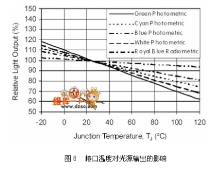 散熱設(shè)計(jì)是LED光源區(qū)別于傳統(tǒng)光源的課題之一。傳統(tǒng)燈具產(chǎn)生的熱遠(yuǎn)高于LED,但傳統(tǒng)燈具不會(huì)因?yàn)楦邷囟档推涔庠摧敵瞿芰Γ蹋牛牡墓廨敵鰠s會(huì)隨著本身接口(Junction, PN接口)溫度的升高而下降,如圖8所示。而其產(chǎn)生的熱如何散除到外界環(huán)境與其封裝結(jié)構(gòu)材料息息相關(guān),牽涉到使用的散熱材料與相關(guān)外型,關(guān)系如圖9所示,其中熱阻的概念,代表輸入W功率時(shí),需要提高多少K溫度才足以散熱。以現(xiàn)有的封裝技術(shù)最高可允許LED操作在185℃(Lumiled K2),但一般因?yàn)榉庋b膠材的關(guān)系,可允許的操作溫度約在125℃,除了考慮光源輸出效率之外,亦考慮封裝膠材的變質(zhì)(樹(shù)脂類材料在高溫有老化現(xiàn)象)。