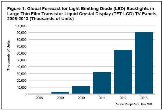 圖1所示為iSuppli公司對(duì)于2008-2013年全球LED電視面板市場(chǎng)的預(yù)測(cè)。