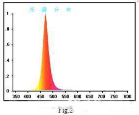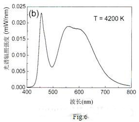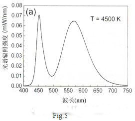 以InGaN藍光LED和1號熒光粉制成的白光LED的發(fā)射光譜示如Fig.6,其光效為55lm/W,色溫4500K。這是本人所知道白光LED的最高光效報導(據(jù)測試國內(nèi)1W白光LED的光通量大多在40lm以下)。采用2號和3號混合熒光粉試制的白光LED的發(fā)射光譜示如Fig.7,其顯色指數(shù)提高到82,色溫4200K,但光效確降低到20lm/W。