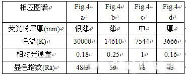 我們曾對此進行了實驗研究,我們利用某公司生產(chǎn)的1W高亮度藍光LED,其光譜的中心輻射波長為470nm見Fig.3,去除外封裝后分別涂敷不同厚度的輻射的中心波長為560nm的黃光熒光粉涂層,經(jīng)處理后測量其發(fā)射光譜。從二十余種不同厚度的樣品中選擇了四種典型情況,其結果見Fig