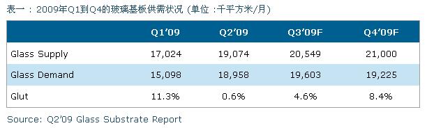 由此份報告中計算出玻璃基板的供需狀況(如下表),玻璃基板在2009年第二季每個月平均需求預估超過1千890萬平方米,較2009年 Q1成長26%,而玻璃基板的供應狀況從第一季到第二季僅成長12%,供應端成長的速度遠遠趕不及需求的快速成長。