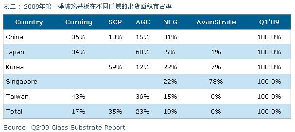 而日本前三大主要玻璃基板供貨商包含:Asahi(AGC, 旭硝子)在2008年第四季占22%,而2009年第一季上升到23%;Nippon(NEG, 日本電氣硝子)在2008第四季占18%,而2009年第一季也上升到19%;而AvanStrate’ 在2008年第四季占5%,而2009年第一季同樣也上升達6%。