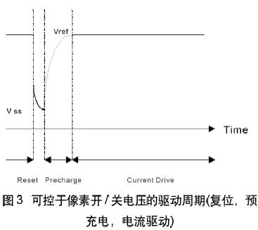 PMOLED彩色顯示要求的驅(qū)動機理和信號互換系統(tǒng)非常復雜。SSD1338的驅(qū)動器采用復用的尋址算法,每個驅(qū)動周期由放電(復位),電壓預充電和電流驅(qū)動三個階段組成(如圖3所示)。