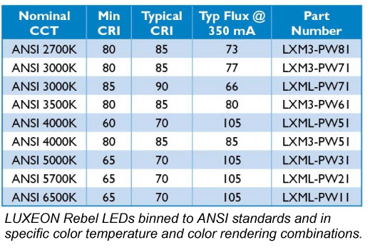 這九款新的LUXEON Rebel LED產(chǎn)品根據(jù)美國(guó)國(guó)家標(biāo)準(zhǔn)化組織(ANSI)的標(biāo)準(zhǔn)進(jìn)行電阻分檔,均達(dá)到了最低規(guī)定演色系數(shù)。每一款產(chǎn)品的光輸出和光通維持率均達(dá)到了ENERGY STAR®和其他光效標(biāo)準(zhǔn)。另外,新產(chǎn)品也具備其他LUXEON Rebel系列產(chǎn)品所公認(rèn)的高效,長(zhǎng)使用壽命及高可靠性的特點(diǎn)。
