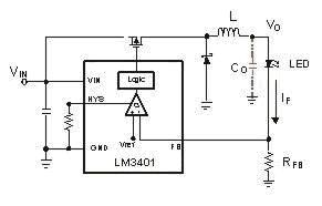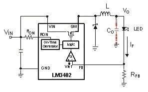 圖1b為一種基本電流型降壓調整器。與恒壓型相似,恒流型降壓調整器可以在輸入電壓變化的情況下,通過控制占空比或頻率的變化使輸出電流IF保持恒定。輸出所需的電流由下面的公式計算得到(Eq.2):