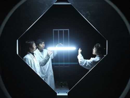圖:天津工業大學半導體照明工程研發中心的科技人員在測試LED燈光通量大小