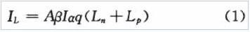 式中,A為p-n結(jié)面積,q是電子電量,Ln、Lp分別為電子和空穴的擴(kuò)散長度,J表示以光子數(shù)計(jì)算的平均光強(qiáng),α為p-n結(jié)材料的吸收系數(shù),β是量子產(chǎn)額,即每吸收一個(gè)光子產(chǎn)生的電子一空穴對(duì)數(shù)。