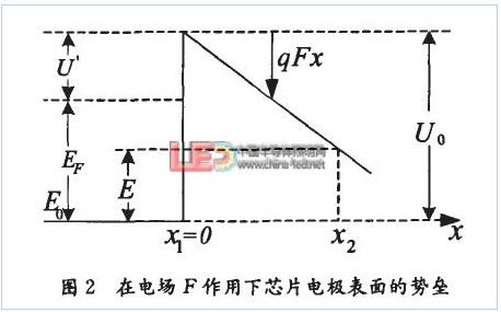 x指向?yàn)樾酒姌O表面到壓焊點(diǎn),為膜層中z方向任意點(diǎn)的勢壘,E是垂直芯片電極表面速度為vx電子的能量。