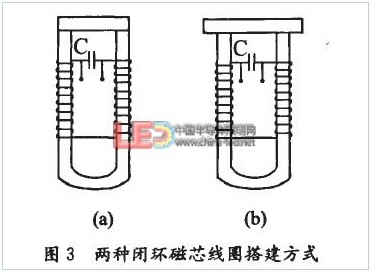 在磁芯材料確定的情況下,為了得到較大磁感應(yīng)強(qiáng)度B,需改變線圈中磁芯的結(jié)構(gòu)。若磁芯結(jié)構(gòu)設(shè)計(jì)為環(huán)形,由式(8)知,磁感應(yīng)強(qiáng)度B增大倍數(shù)理論上與磁芯的相對(duì)磁導(dǎo)率盧,大小相等,檢測信號(hào)幅值將達(dá)到最大。與條形磁芯同種材質(zhì)的u型磁芯上搭接一塊條形磁芯就構(gòu)成環(huán)形磁芯線圈,其搭接方式有兩種,如圖3示。