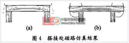 檢測時(shí)將繞有線圈的U型磁芯的一端插入圖1所示1閉合回路,感應(yīng)LED支架回路中回路電流產(chǎn)生的交變磁通,再將條形磁芯搭接在U型磁芯上,使感應(yīng)磁路閉合。由于搭接方式不同,兩種搭接方式的磁芯線圈處在支架回路所產(chǎn)生的交變磁場中時(shí),其搭接處磁路也將不同,用AnsoftMaxwell軟件仿真兩種搭接方式的磁芯搭接處在交變磁場中的磁回路,結(jié)果如圖4示