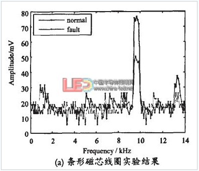 ①焊接質(zhì)量合格的LED,實(shí)驗(yàn)檢測值與理論計(jì)算值相吻合。圖5(a)為使用條形線圈磁芯的實(shí)驗(yàn)結(jié)果,封裝工藝中焊接質(zhì)量合格的LED,信號(hào)檢測端產(chǎn)生的光激勵(lì)信號(hào)經(jīng)放大、濾波、峰值檢波后幅值約為60mV。選12mil黃色LED芯片進(jìn)行理論值計(jì)算,芯片面積A=0.3mm×0.3mm,取β=0.5當(dāng)單位時(shí)間內(nèi)單位面積被半導(dǎo)體材料吸收的平均光強(qiáng)(以光子數(shù)計(jì))為5.45×1021個(gè)/m2s時(shí),由式(1)可計(jì)算出光生電流約為42μA。由畢奧-薩伐爾定理、疊加定理及法拉第電磁感應(yīng)定律,可求得12mil黃色LED芯片在信號(hào)檢測端感生電動(dòng)勢幅值約為63mV,去除實(shí)驗(yàn)誤差和計(jì)算誤差,理論值和實(shí)驗(yàn)值較好地吻合。