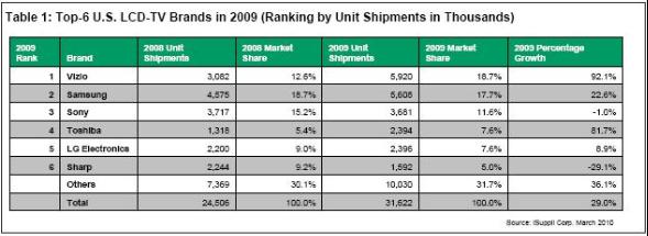 據(jù)iSuppli公司,Vizio在2009年成為美國市場的領(lǐng)先液晶電視品牌,而三星電子則在總體平板電視市場排名第一。