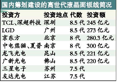 截至目前,國(guó)家發(fā)改委批準(zhǔn)的高世代液晶生產(chǎn)線項(xiàng)目有昆山的龍飛光電、深圳的華星光電以及北京的京東方等國(guó)內(nèi)企業(yè)主導(dǎo)的項(xiàng)目,日本和韓國(guó)企業(yè)的項(xiàng)目還在焦急等待。