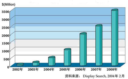 根據(jù)全球權威平板顯示器(FPD)市場調研和咨詢機構DisplaySearch在2004年12月的最新統(tǒng)計(見表2),OLED行業(yè)2004年全年總收入為3.28億美元,比2003年增長了41%。上圖為DisplaySearch2004年2月對全球OLED市場的預測。