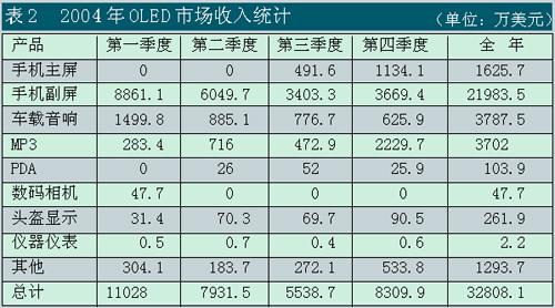OLED已進入的產(chǎn)品領域包括手機主屏和副屏、汽車音響、MP3、工業(yè)儀表、PDA、車載儀表、數(shù)碼相機和微顯示器(MicrodisplayforNearEyeApplication)等領域。其中,手機副屏約為2.2億美元,占67%,汽車音響約為0.38億美元,占11.6%,MP3屏為0.37億美元,占11.3%,這三者共占了約90%。