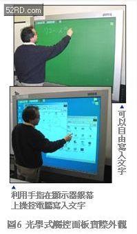 光學式觸控面板的設計必須考量雷射光線對人眼的安全,因此採用低功率半導體雷射,然而低功率半導體雷射卻會引發復歸光量不足等現象。此外,CCD會同時擷取燈泡與太陽等外部光線,必需透過軟體的信號處理技術克服。圖6是光學式觸控面板實際外觀。一般認為,大型光學式觸控面板非常適合應用在教育、運動以及各種商務簡報等領域。