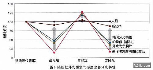 由于廠商對分光特性非常重視,因此分光特性的開發競爭也最激烈。如表1所示目前商品化的照度感測元件,它的分光特性峰值大約是,相當接近人眼的視感度峰值,不過似乎還無法滿足市場的需求,主要理由是隨著螢光燈、白熱燈、太陽光等光源的不同,輸出光電流會出現極大差異,例如白熱燈的輸出光電流是螢光燈的倍,加上顯示器的輝度與人眼感受的亮度有差異,因此在不同環境下經常因為光源的差異無法獲得預期效果。造成上述現象主要原因是各光源的發光頻譜差異極大,加上照度感測元件具備人眼無法感測紫外光與紅外光的感度,因此德國OSRAM推出具備適合人眼視感度,而且分光特性峰值含蓋短波長到長波長范圍的照度感測元件;OSRAM表示,光源造成該元件的輸出電流差異可望低于以下(圖5)。