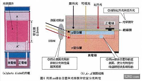 如圖6所示,分光特性可透過照度感測元件結構上的改良獲得調整,基本上它是改變的接合位置(吸光產生電力),同時配合分光特性的峰值利用光學濾光片(filter)去除紫外光與紅外光。新日本無線根據上述動作原理進行分光特性最佳化設計,再以光罩(mask)遮斷從光二極管側面入射的光線,藉此捨棄光學濾光片傳統結構;德國OSRAM則採用新材質與新結構,未使用傳統的改善對策,大幅提升照度感測元件的分光特性。