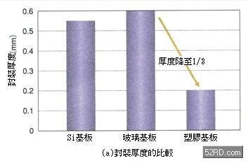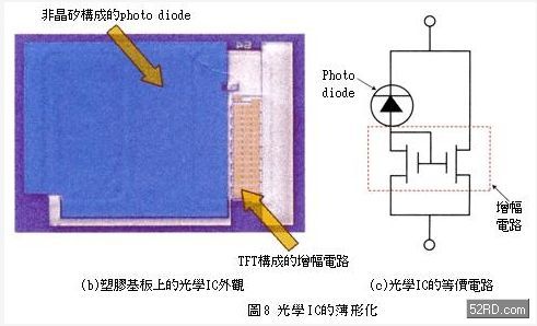 有關封裝薄形化的發展,以TDK與半導體能源研究所共同開發的照度感測元件為例,它是採用塑膠材料當作基板,開發厚度只有與「0402size」、「0603size」等被動元件同等級的照度感測元件;相較之下傳統玻璃基板的照度感測元件卻高達(圖8),該公司也在開發內建可以使光電流增幅100倍增幅電路的PhotoIC,外形尺寸則與「2015size」同等級(圖8(b))。