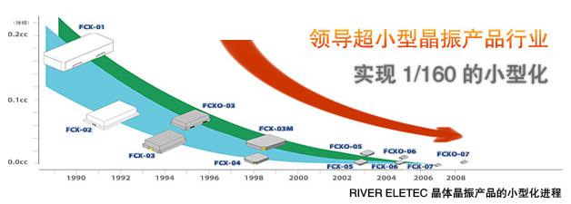 在水晶元器件的小型化方面,大河晶振一直處于領先地位。公司在2008年開發的晶體FCX-07的體積與1989年開發的晶體FCX-01相比,實現了1/160的超小型化。RIVER ELETEC的技術開創了水晶元器件的新市場。