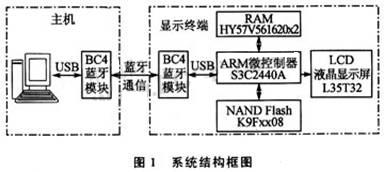 顯示終端由以ARM9微控制器S3C2440A為核心的嵌入式Linux平臺加上BlueCore4藍牙模塊以及LCD液晶顯示屏組成。Linux操作系統安裝在NANDFLASH中,并連接了64MB的外擴RAM。由于S3C2440A接口比較豐富,所以系統硬件具有較好的擴展性能。