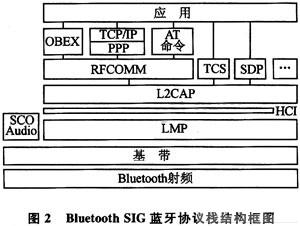 系統通過藍牙協議棧的RFCOMM協議層進行通信。RFCOMM協議提供串行數據傳輸,并能在2臺藍牙設備之間同時維持多達60個連接,可以同時支持遺留串行端口應用程序以及其他應用程序中的OBEX協議。藍牙協議棧的結構框圖如圖2所示。