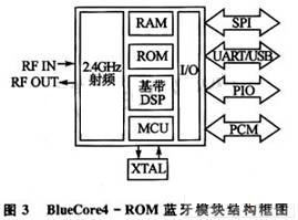 主機端和顯示終端都使用了CSR公司BlueCore4-ROM芯片組成的藍牙無線收發模塊。BlueCore4系列符合2.0版藍牙標準,并與現有1.1版和1.2版藍牙設備完全兼容。這里采用的BlueCore4-ROM芯片具有很高的集成度,需要很少的外圍露件。它提供了UART、USB2.0等主機接口,并且提供了PCM音頻接口以及SPI接口。具有支持微微網和散射網,低功耗,和手機良好兼容,可以和802.11協議共存等優點。BlueCore4藍牙模塊結構如圖3所示。