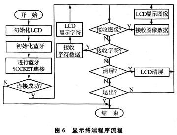 系統軟件同樣分為主機部分和顯示終端部分。這里主要分析顯示終端部分軟件的設計,主機部分與其類似。顯示終端部分程序包括:LCD液晶屏初始化,藍牙設備的初始化,藍牙連接的建立和圖像字符數據的傳輸顯示等幾個部分。程序流程如圖6所示。