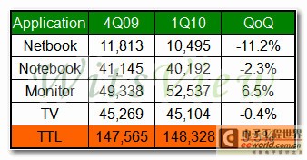 根據市場研究機構WitsView 的統計,2010年第一季全球大尺寸TFT-LCD面板整體出貨,延續去年第四季的成長動能,總出貨量增加至14,832萬片,不斷刷新面板歷史出貨高點,更創下連續五季正成長的紀錄。雖然出貨季成長僅0.5%,但和去年同期相比,亦有高達71.9%的傲人成長。