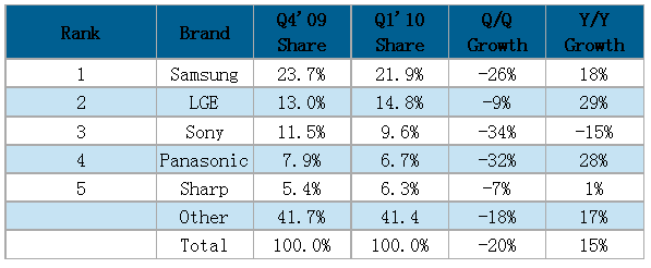 一季度三星電子(Samsung)出貨營收比率較去年第四季稍微下滑,不過利潤率相對較其它廠商好,出貨金額比率達21.9%。同時三星電子持續(xù)在新技術如LED與3D電視方面領先其它廠商,這也是該公司持續(xù)良好增長與較高產品價格主要原因。以應用技術別來看,三星電子在LCD TV全球排名第一,在等離子電視則排名第二。