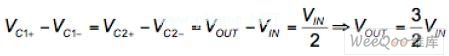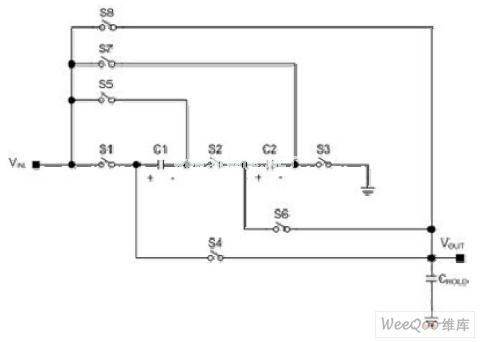 輸出電容CHOLD提供輸出負載電流。隨著這個電容的放電,輸出電壓降低到期望的輸出電壓以下,第二個階段是被激活來將輸出電壓增高到這個值以上。在第二階段,C1和C2并聯,連接在VIN和VOUT之間。開關S4到S7關閉,而S1到S3和S8打開。因為電容兩端的電壓降并不能突變,輸出電壓跳變到輸入電壓值的1.5倍︰