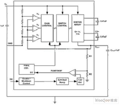下調的輸出電壓通過PUMP/SKIP比較器與1.2V的電壓基準比較。PUMP/SKIP比較器輸出電壓在啟動時線性上升,提供軟啟動功能。當輸出電壓超過期望的極限,器件不會開啟,消耗的電源電流將很小。在這種空閑狀態的期間,輸出電容CHOLD提供輸出負載電流。隨著這個電容不斷放電以及輸出電壓降低到期望的輸出電壓以下,電荷泵被激活直到輸出電壓再次達到高于這個值。