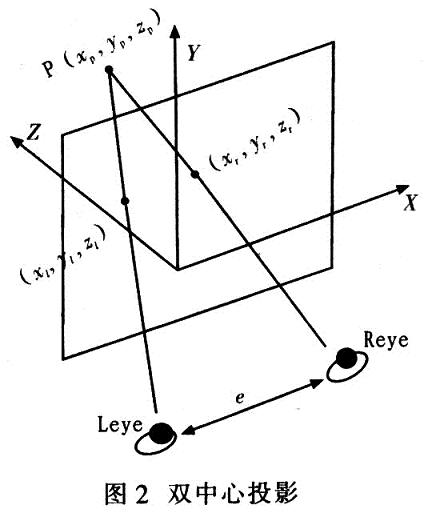 由以上研究可知,立體圖像對的產生是由于左、右眼觀察到的物體透視結果不同。因此在立體顯示的視景仿真中設置兩只虛擬的眼睛,一個獲取左眼的圖像,另一個獲取右眼的圖像,分別將左右眼的圖像傳送給相應的眼睛。因此。在立體顯示中,需要采用包含兩個視點的透視投影方法一雙中心投影算法。圖2為雙中心投影。