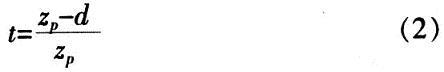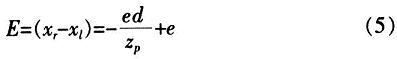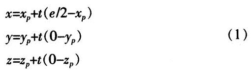 左視點Leye和右視點Reye均位于X軸上,兩視點間的距離為e,兩視點連線中心為坐標原點,則左視點的坐標為(-e/2,0,0),右視點的坐標為(+e/2,0,0)。投影平面平行于XY平面,到左右視點的距離均為d。三維空間中一點P(xp,yp,zp)在左視點投影中的坐標為(xl,yl,zl),在右視點投影中的坐標為(xr,yr,zr),則zl=zr=d。點P(xp,yp,zp)和Reye投影線的參數方程為: