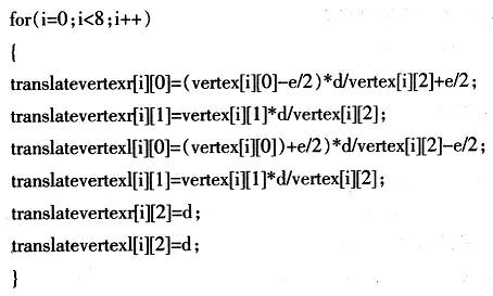 按上述投影算法計算出立體圖像對后,應用OpenGL繪制立體圖像對,分別用紅、綠兩種顏色繪制右眼和左眼的圖像。以一個變長為10cm,中心點在原點的正方體為例,設兩視點間距離e為5cm,投影面距高觀察者d為40cm,考察正方體的一個頂點(5,5,5),由上述投影算法可得:xr=32cm,xl=48cm,yl=yr=4040cm,zr=zl=d=40cm對8個頂點分別計算后,連接相應的立體透視投影點,即可得該立方體的立體圖像對。用數組vertex[8][3]存儲頂點,數組translatevertexr[8][3]存儲右眼投影計算后坐標,數組translatevertexl[8][3]存儲左眼投影計算后的坐標,對相應的點進行投影計算: