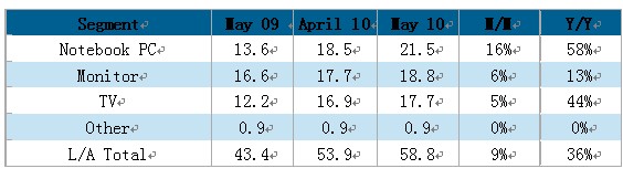 所有應(yīng)用種類都較上月有更高的增長(zhǎng),特別是筆記本電腦、上網(wǎng)本與平板電腦用面板增長(zhǎng)尤為顯著,較4月增長(zhǎng)16%。