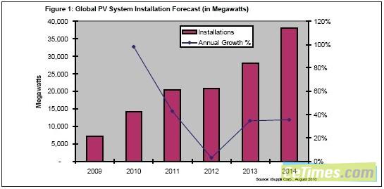 預(yù)計(jì)今年全球光伏裝機(jī)容量將增長到14.2GW,比2009年的7.2GW大增97.2%,而且也沒有明年降溫的跡象。圖1所示為2009-2014年全球光伏裝機(jī)容量預(yù)測,2014年新增光伏系統(tǒng)預(yù)計(jì)將達(dá)到38.1GW。