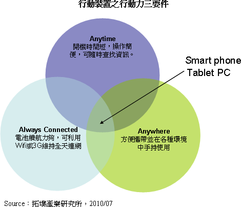 拓墣認為,在平板熱潮下,臺廠在開發自己的平板產品時也應將iPad的「Anytime、Anywhere、Always Connected」特色,列入開發時的設計重點,否則推出的產品恐將只是具備觸控螢幕的小筆電,而非符合消費者需求的平板裝置。