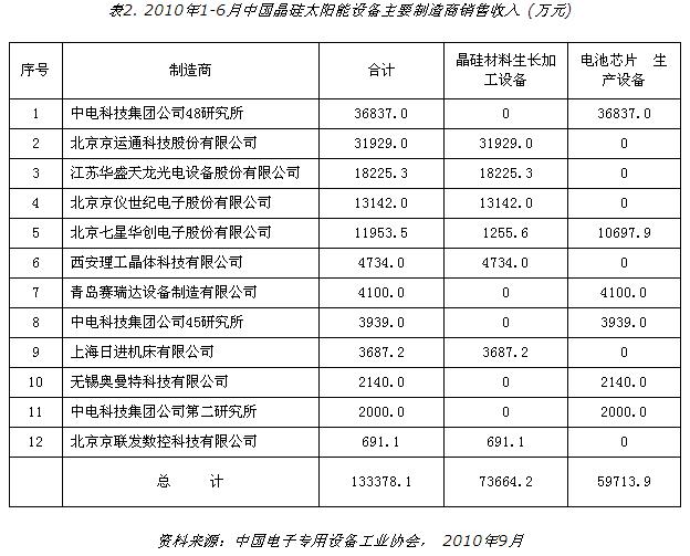據協會副秘書長金存中介紹,晶硅太陽能行業的快速增長是眾多設備企業快速發展的關鍵。占電子專用設備銷售收入一半的半導體設備,今年上半年銷售收入比去年同期增長了50.3%,達到16.79億元,這主要來自上半年光伏產業對晶硅太陽能設備需求的增長。上半年半導體設備的銷售收入中,晶硅太陽能設備占79.5%,達到13.34億元。其中,晶硅材料生長加工設備7.37億元,電池芯片生產設備5.97億元。