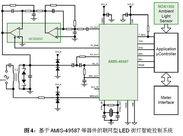 設計人員可以采用安森美半導體的AMIS-49587電力線載波(PLC)調制解調器、PLC線路驅動器NCS5650和諸如NOA1302這樣的環境光傳感器,基于電力線輕易地構建聯網型LED街燈智能控制系統(參見圖4)。其中,安森美半導體的環境光傳感器包含的輸出類型,如NOA1302和NOA1305提供的是數字輸出,而NOA1211為模擬輸出。這些光傳感器的工作電流極低,在100流明光輸出條件下分別僅為58 μA、550 μA和115 μA,因而對系統能效的影響極小。